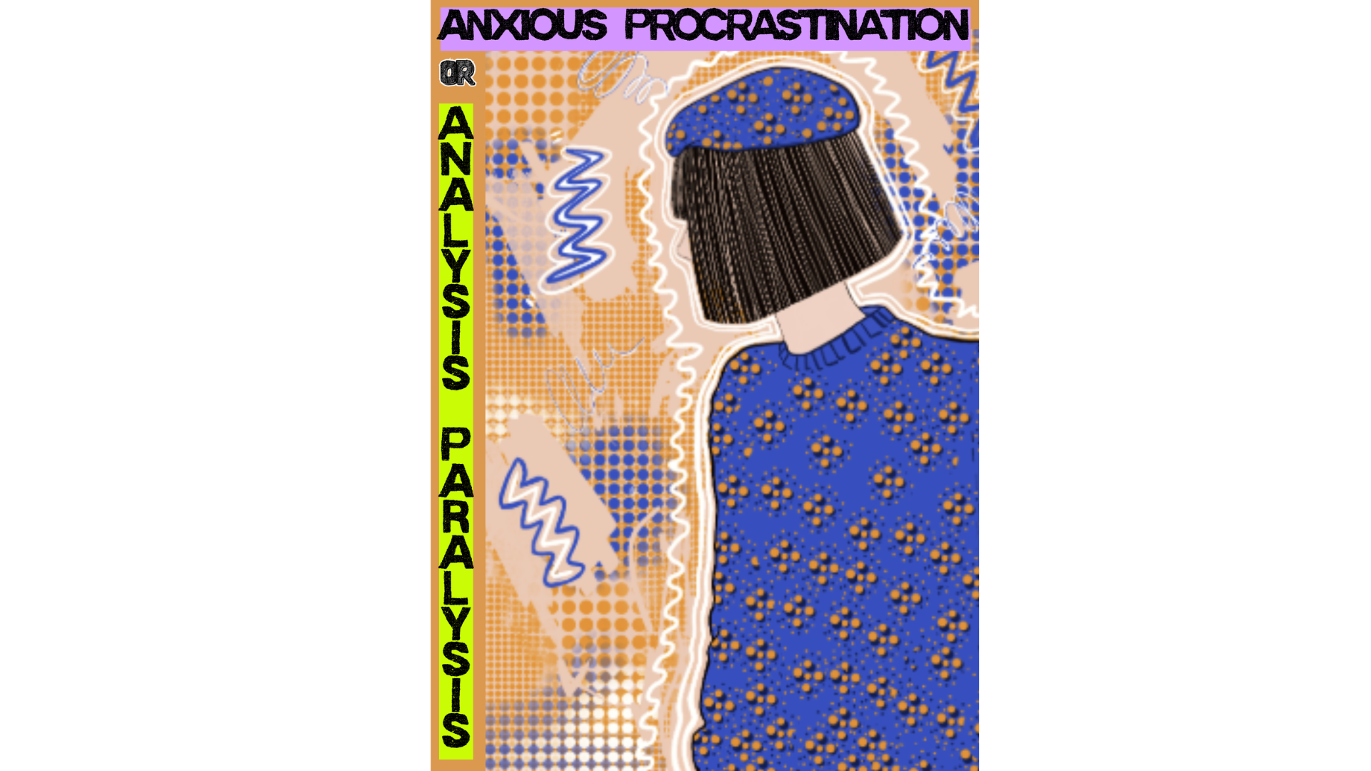 Typography and layout also play a conceptual role in the illustration. The vertical phrase “Analysis Paralysis” emphasizes the feeling of being stuck or suspended, while the headline “Anxious Procrastination” frames the emotional root of the problem. Together, these elements echo the article’s central message: that many people who procrastinate are not unmotivated but overwhelmed by the pressure to do things perfectly. By combining expressive illustration with graphic editorial elements, the artwork transforms an abstract psychological experience into a visually engaging narrative about overthinking, anxiety, and the struggle to begin.