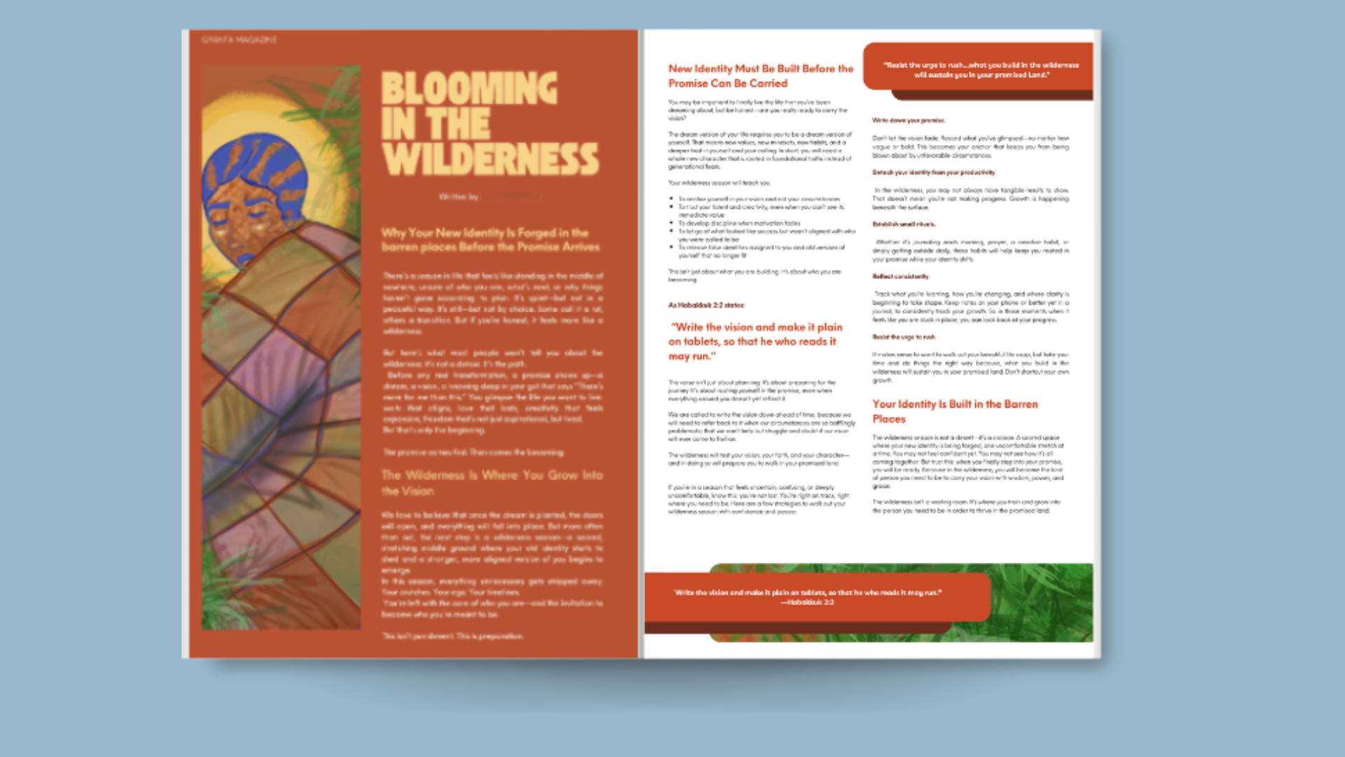 Within the editorial spread, the illustration functions as both a narrative anchor and a conceptual centerpiece. Its layered composition mirrors the article’s message that identity is built piece by piece through vision, struggle, and eventual elevation. By integrating expressive color, symbolic imagery, and a contemplative figure, the artwork translates the essay’s themes into a visual language that invites readers to reflect on their own seasons of growth and transformation.